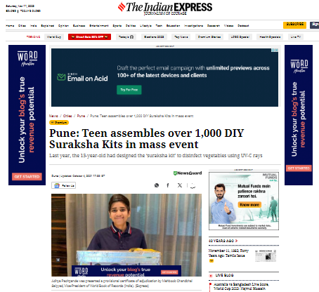 Last year, the 15-year-old had designed the ‘suraksha kit’ to disinfect vegetables using UV-C rays Online Article by The Indian Express Know More : https://indianexpress.com/article/cities/pune/pune-teen-assembles-over-1000-diy-suraksha-kits-in-mass-event-7549114/Master Aditya Pachpande, Founder, NextGenInnov8 Gets Adjudicated By World Book Of Records London (UK) For Most DIY UVC Kits Assembled in a Single Day