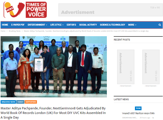 Online Article by Times of Power Voice Know More : https://timesofpowerandvoice.com/2021/10/03/master-aditya-pachpande-founder-nextgeninnov8-gets-adjudicated-by-world-book-of-records-london-uk-for-most-diy-uvc-kits-assembled-in-a-single-day/