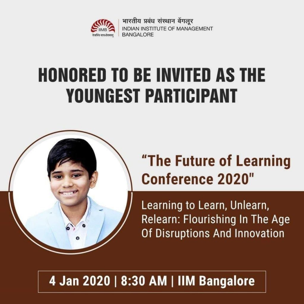 It was a distinct honour to be the youngest presenter at the esteemed Future of Learning Conference 2020, held at the prestigious Indian Institute of Management Bangalore (IIMB). The conference, a convergence of some of the brightest minds in education, provided a platform to delve into the future of learning and educational technology. Among several scholars and educators present, I stood as a testament to the power of youth-driven innovation.